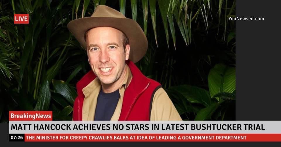 Having impressed many viewers with his ability to cope with spiders, snakes and scorpions, the one time Secretary of State for Creepy Crawlies, was last night once again selected to undertake one of the show’s famous challenges. But charged with running a government department proved just too terrifying for Matt. After just a couple of minutes, during which time those watching his performance looked on in abject horror, he could take it no longer and he chose to abandon the task. CCTV footage subsequently revealed him being consoled by a former aide.