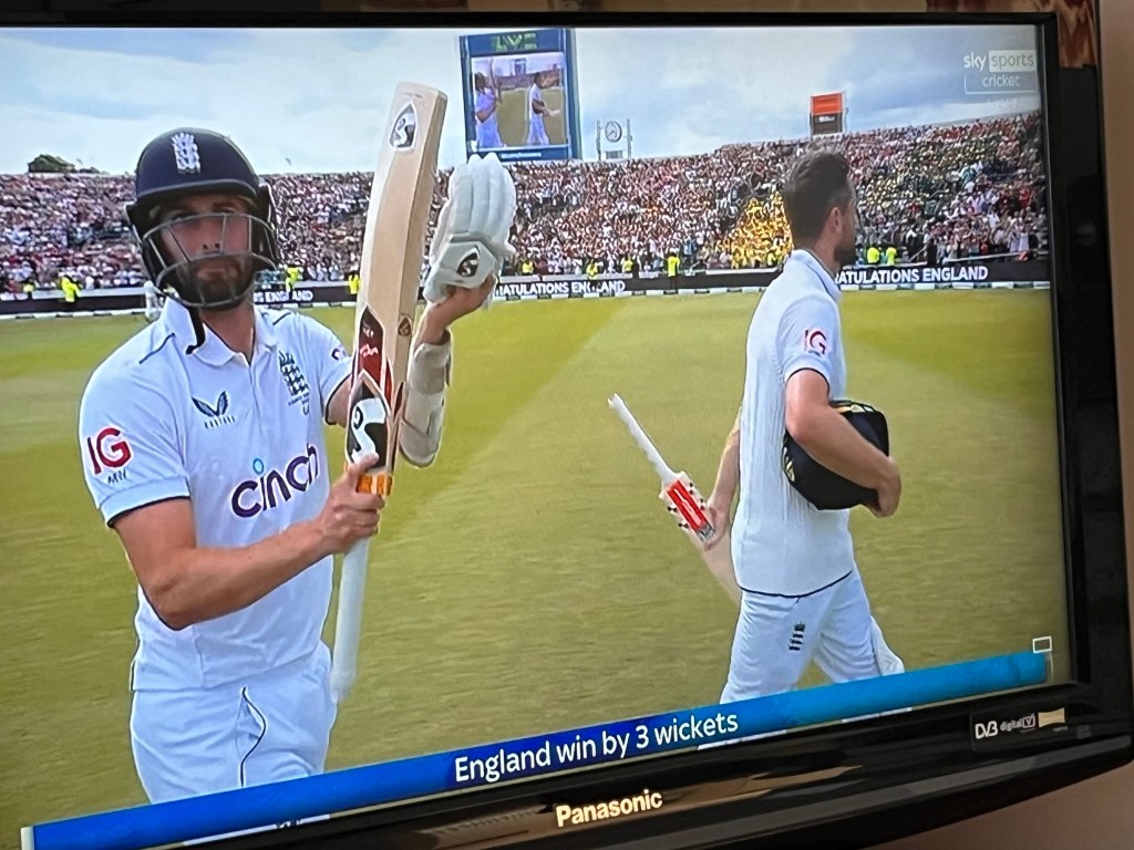 I did consider declaring and putting him in for a tricky 20 minutes in fading light but unfortunately he got called in for his bath and bedtime! What’s more, caught up in the excitement of my belligerent batting display, we missed the opportunity to watch Australian wickets fall late on Saturday afternoon but I, very magnanimously, decided to forgo the chance to press home my advantage by making him field again on Sunday morning and together we watched a little of England’s run chase instead. As you’ll imagine, he was absolutely enthralled, as was all too evident by the fuss that he kicked up when his Dad had to drag him away for a nappy change!