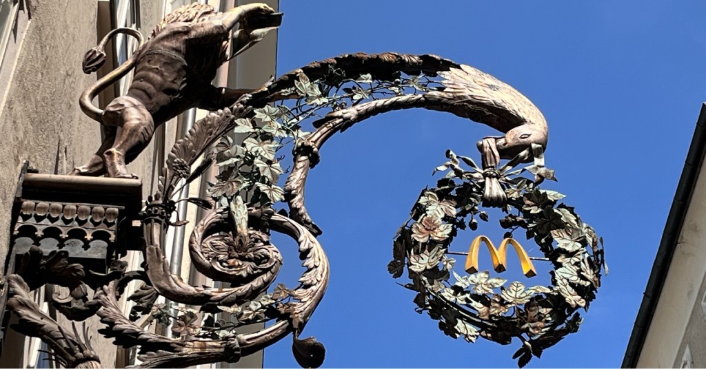 The photograph above is of what purports to be the smallest McDonalds sign in the world. It hangs outside the restaurant which is conveniently located just a couple of crotchets away from where Mozart was born.