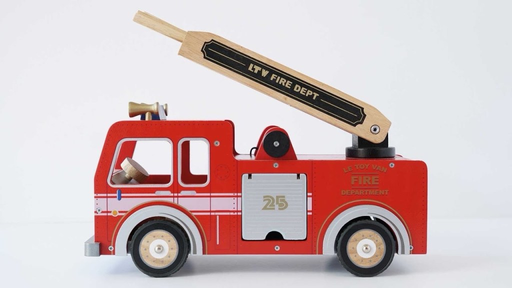 A WOODEN TOY FIRE ENGINE